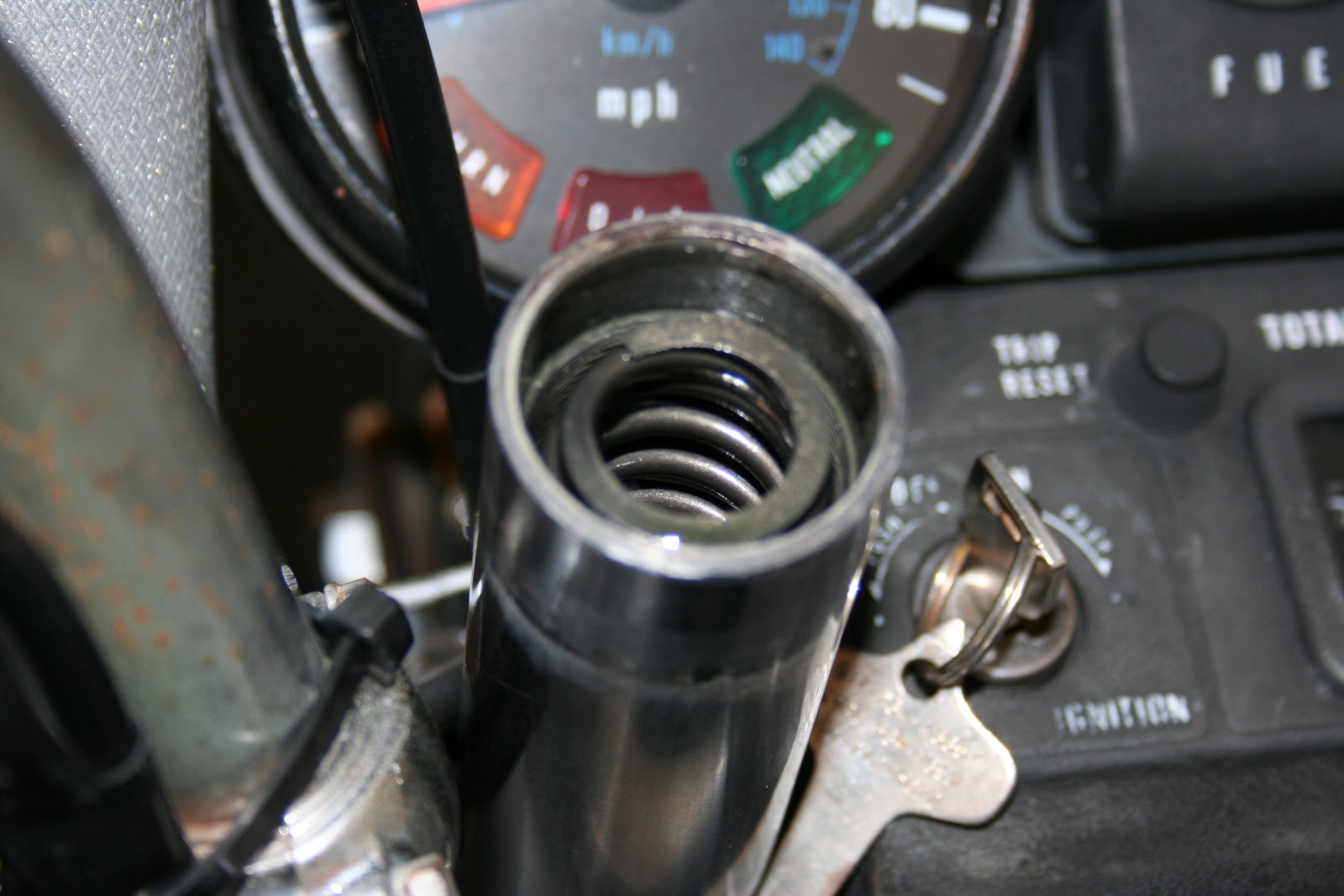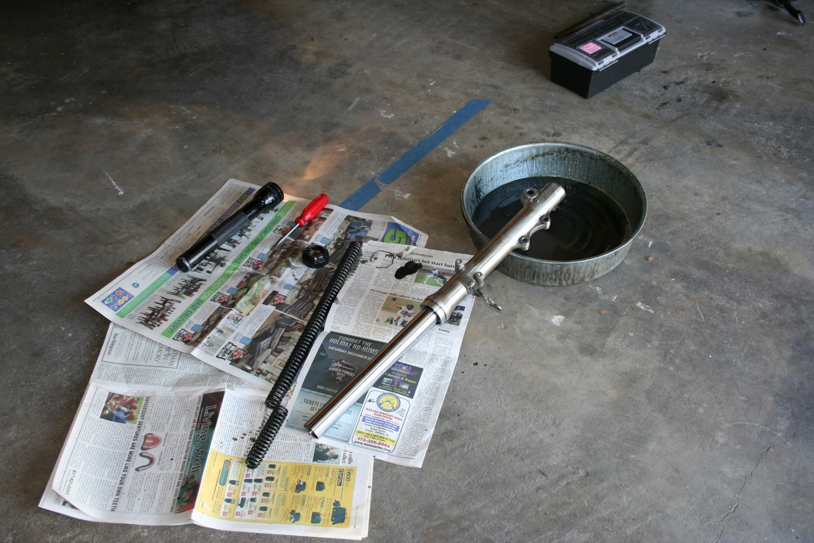 I drained most of the fork oil out of the left side of this picture. There wasn't much oil left. Each fork takes 11.9 fl. oz. and there was barely enough in there to even coat the bottom of the oil pan.
