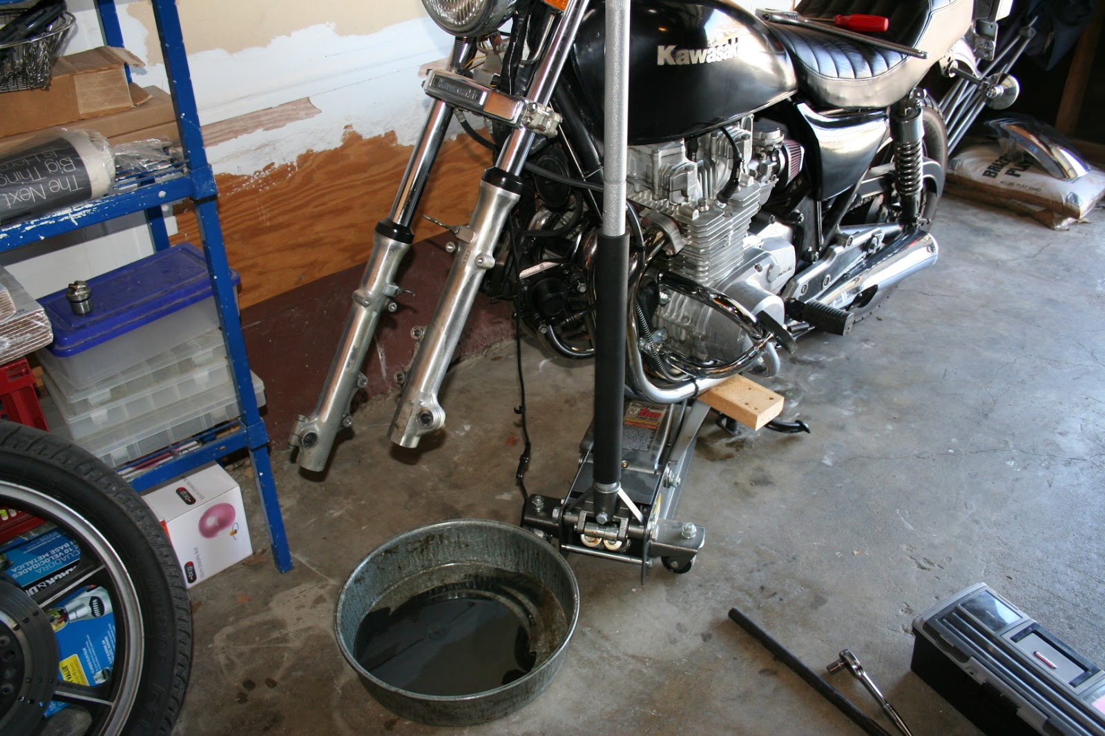 We began by raising the front end with a floor jack and a 2x4 under the frame. Then we removed the calipers and zip-tied them to the frame to keep them out of the way. Doing this prevents having to drain the brake fluid and bleeding the brakes when reassembling. Then off came the wheel and fender. I removed the fork oil drain plug from the left side and then realized we had not taken any pictures.